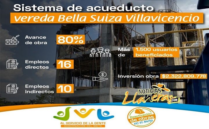 Actualmente la construcción de obras complementarias del sistema de acueducto por parte de EDESA SA ESP en la vereda Bella Suiza, jurisdicción de Villavicencio, tiene un avance superior al 80%, contando con una inversión que supera los $2.323’000.000; generando 26 empleos directos e indirectos.