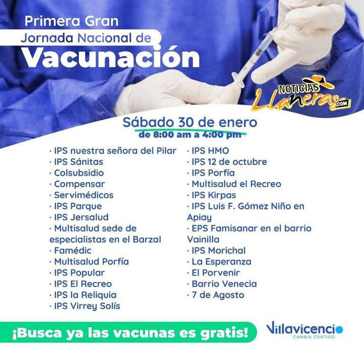 Un total de 25 puestos han sido habilitados para la primera “Gran Jornada Nacional de Vacunación” del sábado 30 de enero, desde las 8:00 am hasta las 4:00 pm en Villavicencio.