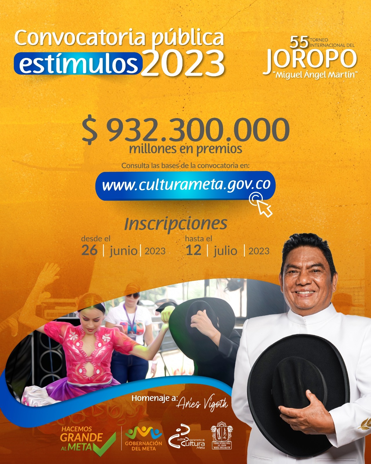 El gobierno departamental, a través del Instituto Departamento de Cultura del Meta (IDCM), anunció que a partir del 26 de junio, está abierta la convocatoria pública de estímulos para apoyar la circulación, formación y gestión dirigida a artistas, actores, portadores y gestores culturales de las diversas áreas artísticas y culturales en el marco del 55º Torneo Internacional del Joropo ‘Miguel Ángel Martín’.