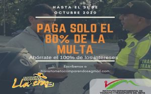 El Instituto Departamental de Transito y Transporte del Meta, invita a los metenses, a efectuar el pago de las multas de tránsito con el descuento total de los intereses, más el 20% del valor del comparendo.