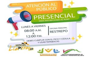 El Instituto Departamental de Tránsito y Transporte del Meta reinició ayer la atención presencial en su Sede Operativa en Restrepo, para todos los usuarios que deseen inscribirse al RUNT.