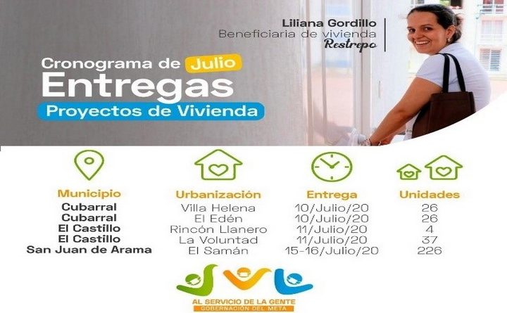 “Comenzaremos este sábado otorgando el beneficio a 26 familias de Villa Helena, y 26 de El Edén. En El Castillo, se realizará la jornada el día 11, con la entrega de 4 casas de Rincón Llanero, y 37 de La Voluntad. Así mismo, los días 15 y 16, en San Juan de Arama, se brindará esta oportunidad a las 225 familias de El Samán”, indicó el mandatario de los llaneros.