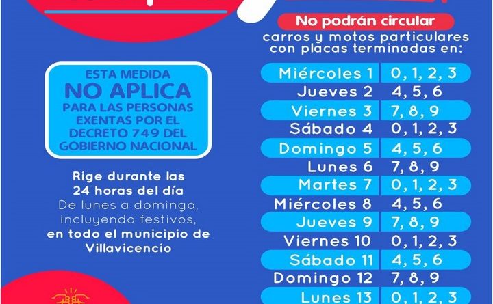 La Secretaría de Movilidad confirmó que el pico y placa para motos y carros particulares en Villavicencio continuará como venía operando y se extenderá hasta el 15 de julio de este año; es decir, seguirá rigiendo de lunes a domingo, incluyendo festivos, durante las 24 horas al día, y no aplicará para las personas exceptuadas en el Decreto 749 de 2020 del Gobierno nacional.