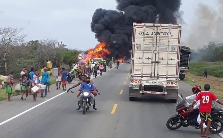 Un carro tanque cargado de combustible se sale de la vía y sufre volcamiento lateral, la situación fue aprovechada por varias personas que llegaron al lugar a saquear el combustible del vehículo quienes resultaron con graves heridas luego de que este vehículo se incendiara.