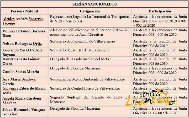 En caso de encontrarse responsables los miembros de la Junta Directiva de La Terminal de Transportes de Villavicencio S.A, para la época de los hechos en mención, serían sancionados con multas de hasta 200 salarios mínimos legales mensuales vigentes, según el art. 86.3 de la Ley 222/95: