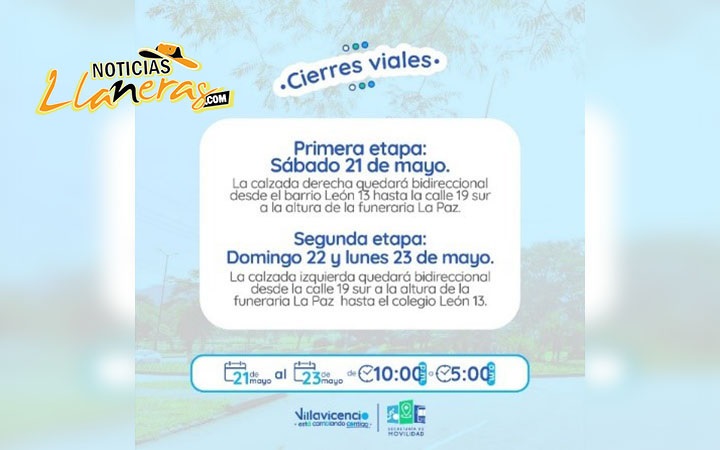 Desde mañana sábado 21 y hasta el lunes 23 de mayo se presentarán cierres nocturnos parciales en la doble calzada de la vía Acacías, desde las 10:00 pm hasta las 5:00 am. Con el fin de izar una de las vigas del puente peatonal de la doble calzada en el sector del barrio Catumare.