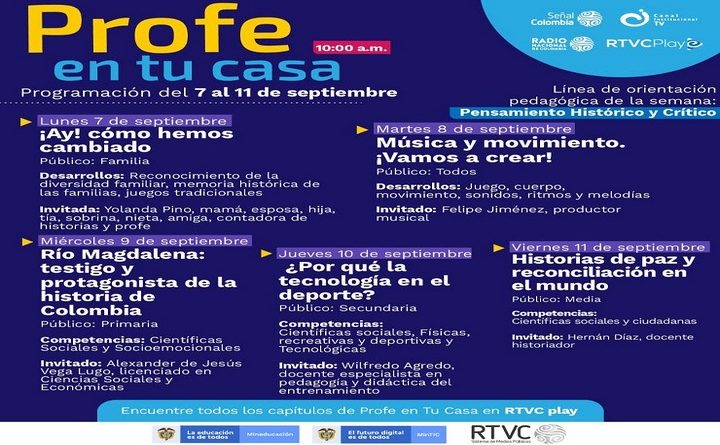 El Ministerio de Educación Nacional continúa acompañando a las familias colombianas en el fortalecimiento de las prácticas de cuidado, crianza y educación de las niñas, niños y adolescentes, a través del programa “Profe en tu Casa”, que se emite de lunes a viernes por Señal Colombia, el Canal Institucional, Radio Nacional y RTVC Play a las 10:00 am y por Canales Regionales.