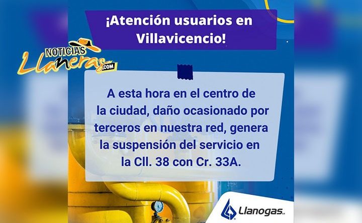 La empresa de Llanogas S.A informa que un daño ocasionado por terceros en la red de gas natural, genera la suspensión del servicio en la Cll 38 con 33A del centro de la ciudad de Villavicencio.
