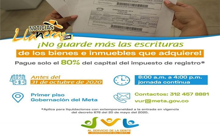 ¿Tiene escrituras sin registrar?, no las guarde más, registre todos los bienes e inmuebles que adquiere; póngase al día y acójase al descuento histórico. En liquidaciones con extemporaneidad pague solo el 80% de capital en el impuesto de registro antes del 31 de octubre de 2020 en el primer piso de la Gobernación del Meta. El horario de atención es de 8:00 am a 4:00 pm jornada continua.